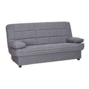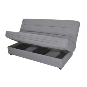 Sofá cama tapizado en loneta con arcón gran capacidad y sistema de apertura clic clac automático. Incluye dos cojines apoya brazos.